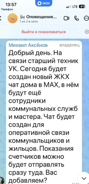В чаты рассылаются сообщения от имени якобы «старшего техника УК» Михаила Аксёнова, который сообщает о создании нового «ЖКХ чата дома в MAX» и предлагает передавать показания счетчиков